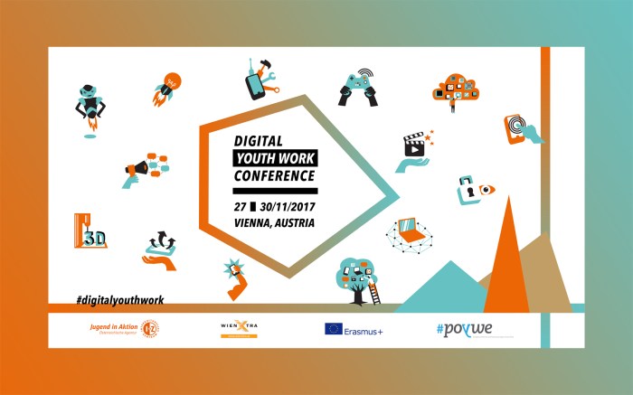 For the conference « Digital Youth Work », which happenned in Vienna, Austria in November 2017, I designed the graphic identity of the event. I produced a variety of materials for the conference participants: conference folder, programme, name tags, hashtag sculpture…