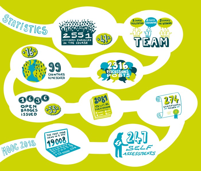 After the end of the MOOC, a few datas and statistics about the online course were picked by the organizers to be visualised in the same style as the graphic recordings of the course.