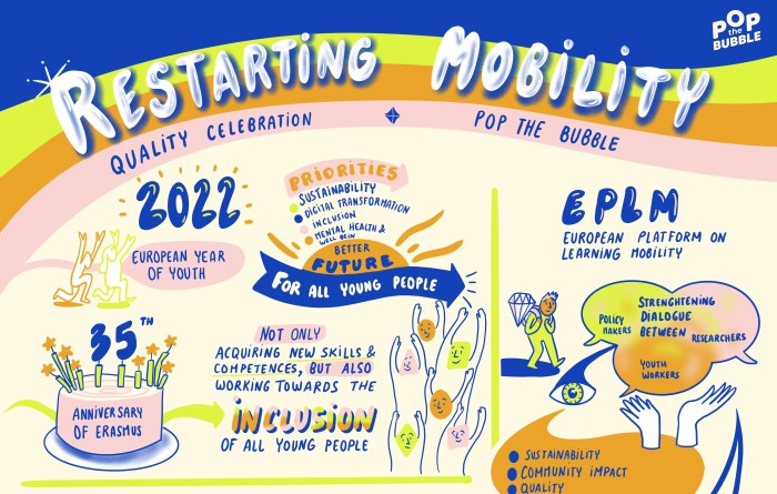 « Last week, on 9th June (2022), experts and youth workers came together to “Pop The Bubble”, to celebrate the relaunching of quality youth mobility projects. This online event was an opportunity to highlight how good quality youth mobility projects are back! We shared best practice, listened to storytelling from projects and learnt about tools (the Quality Tools – or, Q!Tools) developed to help boost the quality of youth mobility projects and make successful applications, using them.